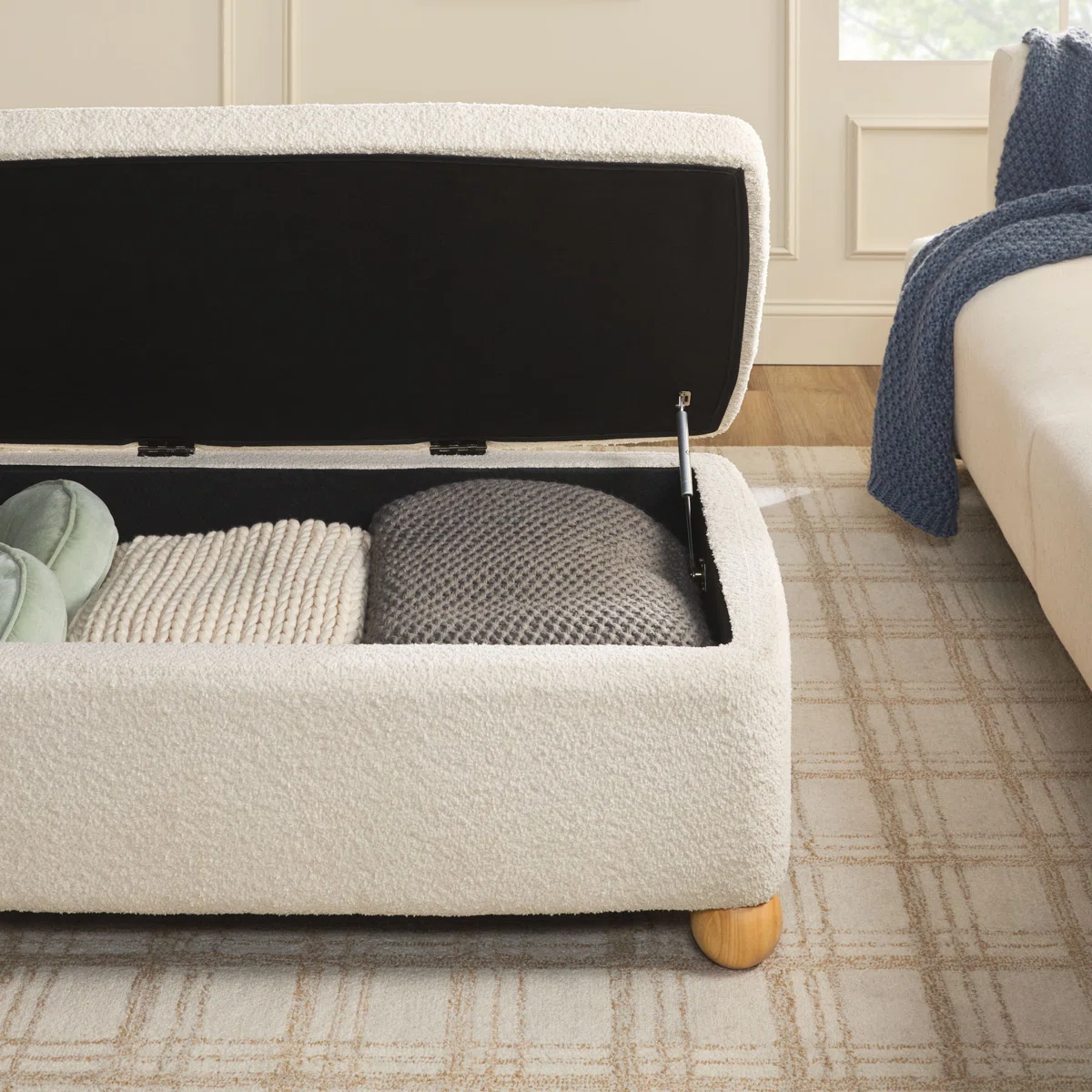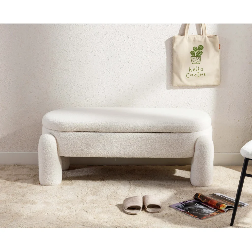 Cozy and stylish, this rectangular ottoman features soft bouclé fabric, rounded wooden feet, and a hinged lid revealing spacious hidden storage. Built on a durable wood frame, it’s perfect as a footrest, extra seat, or coffee table. Easy 5-minute assembly—just twist on the legs, no tools required.