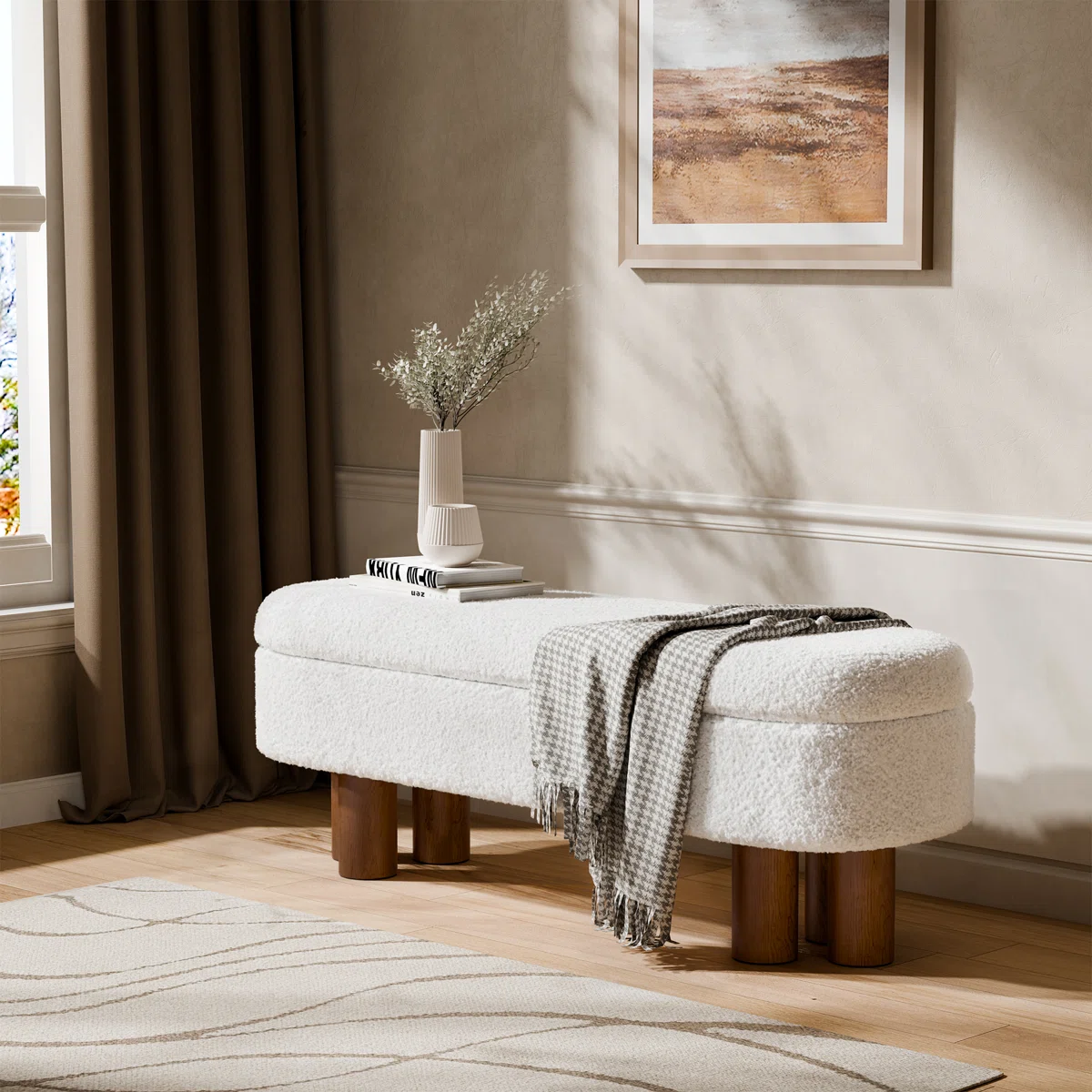 Combine comfort and functionality with this 120 cm upholstered storage bench. Wrapped in soft boucle fabric and supported by natural solid wood legs, it features a cushioned flip-top seat filled with high-density foam. The hidden storage compartment is ideal for blankets, clothes, or daily essentials. Perfect for bedrooms, entryways, or living rooms, it adds cozy style with practical purpose.