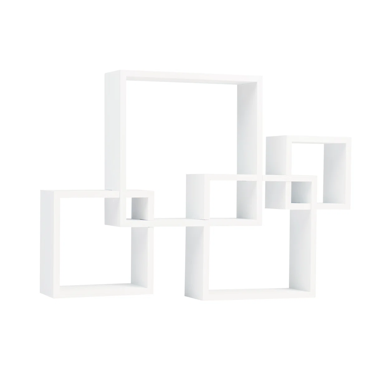 Display your favorite sculptures and photographs with streamlined elegance using this innovative wall-mounted shelf. Crafted from Manufactured Wood with a smooth painted finish, this unique unit features four intersecting cube shelves in varying sizes that create a dynamic visual statement.