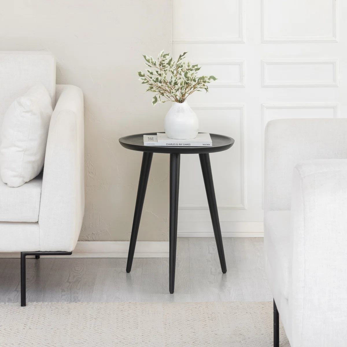 Three elegantly angled, tapered dowel legs recreate the iconic mid-century modern silhouette that never goes out of style. The circular tabletop features a practical raised lip border, providing both visual interest and functional security for your items.