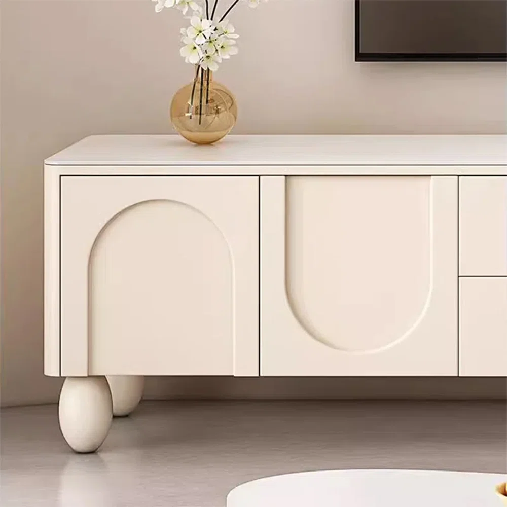 Elevate your living room with this 160 cm TV console, crafted from solid wood with a creamy white finish and imported stone-style top. Featuring sleek lines, round accents, and French-arch-inspired storage, it offers spacious drawers and hidden compartments for organized living. Oak egg-shaped feet protect floors while adding elegance, making this console a sophisticated focal point that blends modern design with timeless charm.